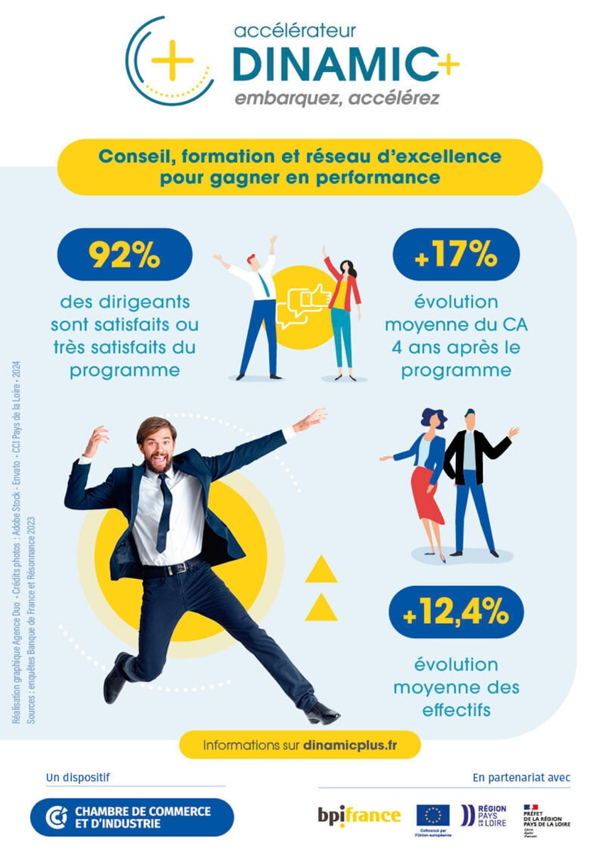 Dinamic + est un parcours proposé par la CCI Pays de la Loire et financé en partie par la région Pays de la Loire et des fonds européens. Destinés aux PME du territoire, le programme Dinamic + se décline sur 6 ou 12 mois.
